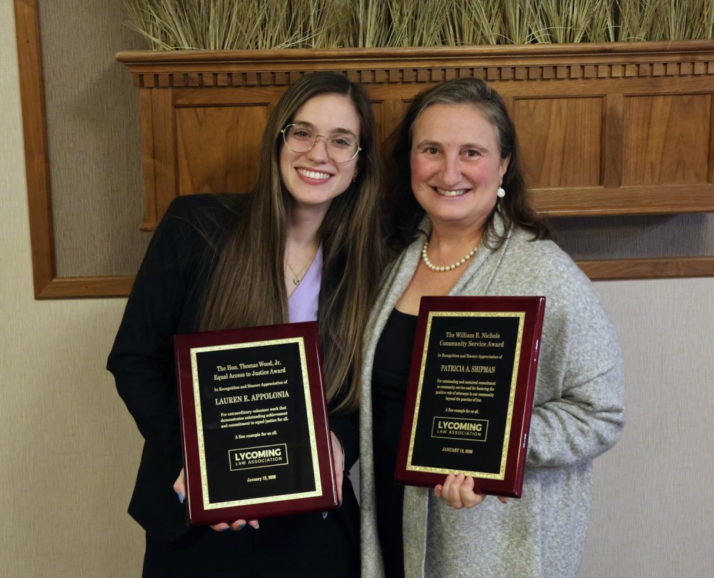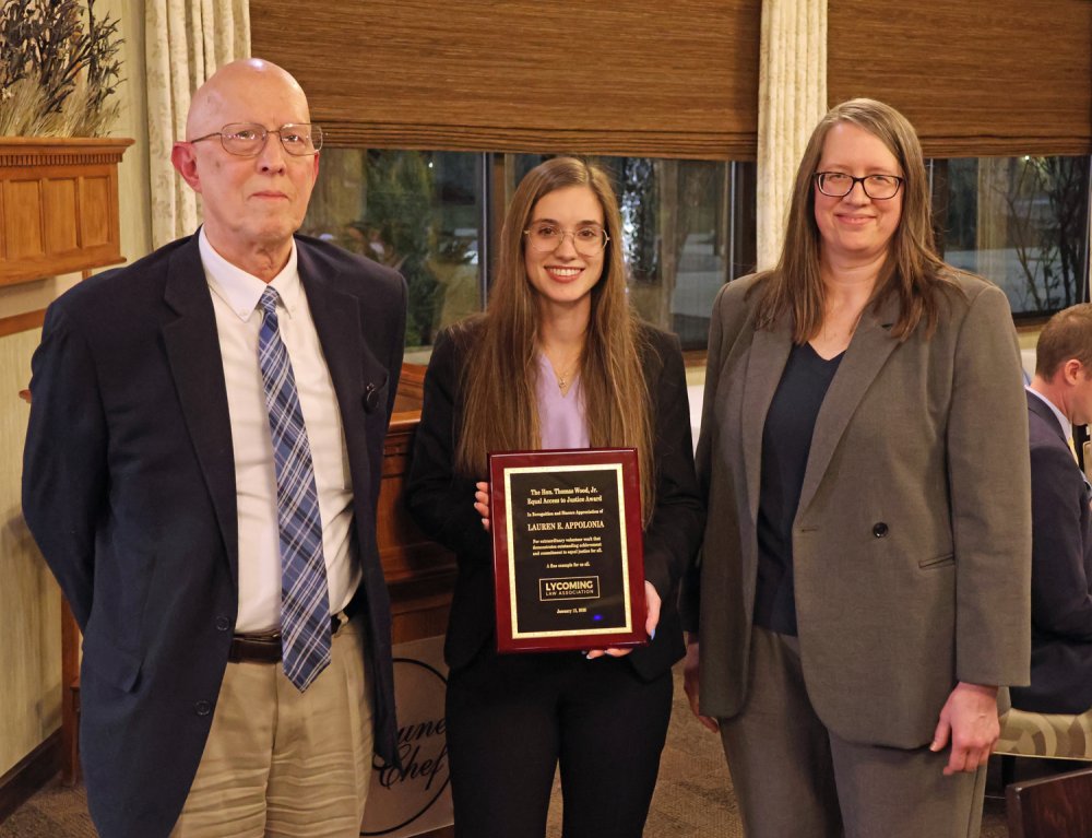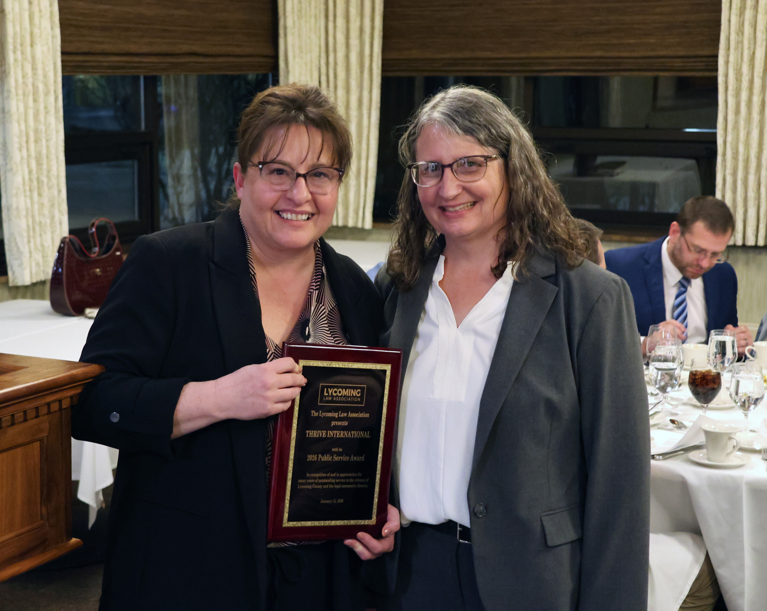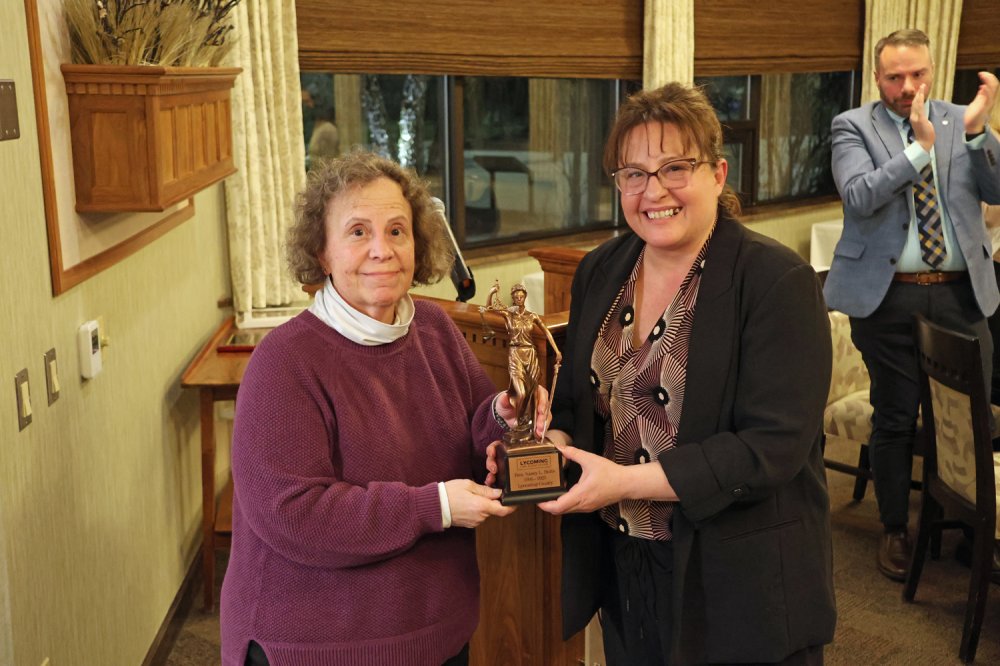 Every year, the Association recognizes a non-lawyer whose public service has had a significant impact in the legal community. The Lycoming Law Association Public Service Award for 2026 was presented to Thrive International. Thrive provides affordable immigration legal services to low-income and vulnerable community members in Williamsport and other areas of Pennsylvania. Executive Directive Jody Lantz accepted the award.